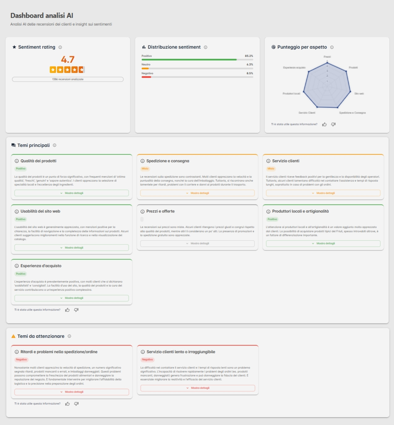 Soluzioni come la nuova dashboard di analisi AI di eShoppingAdvisor permettono di trasformare grandi volumi di recensioni in insight strutturati, leggibili e utilizzabili. L’AI analizza il linguaggio, individua i temi ricorrenti, misura il sentiment associato ai diversi aspetti dell’esperienza e restituisce una visione d’insieme che sarebbe difficilmente ottenibile con un approccio manuale.